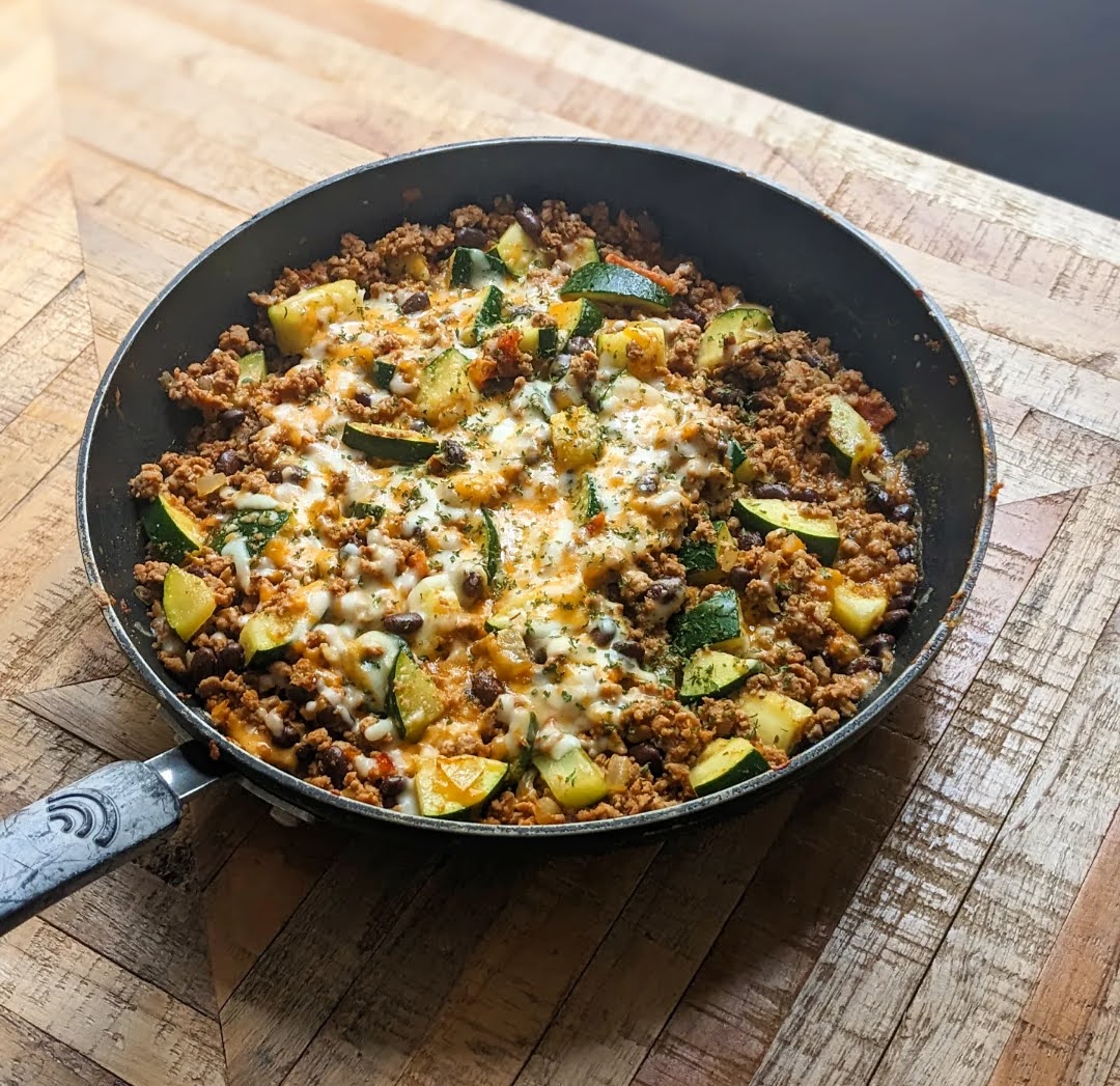 Our Easy Turkey Zucchini Skillet is a one pot meal that’s perfect for busy weeknights! It is made with spices, tomatoes, zucchini and onion. This recipe is full of flavor, low carb, keto and gluten-free.